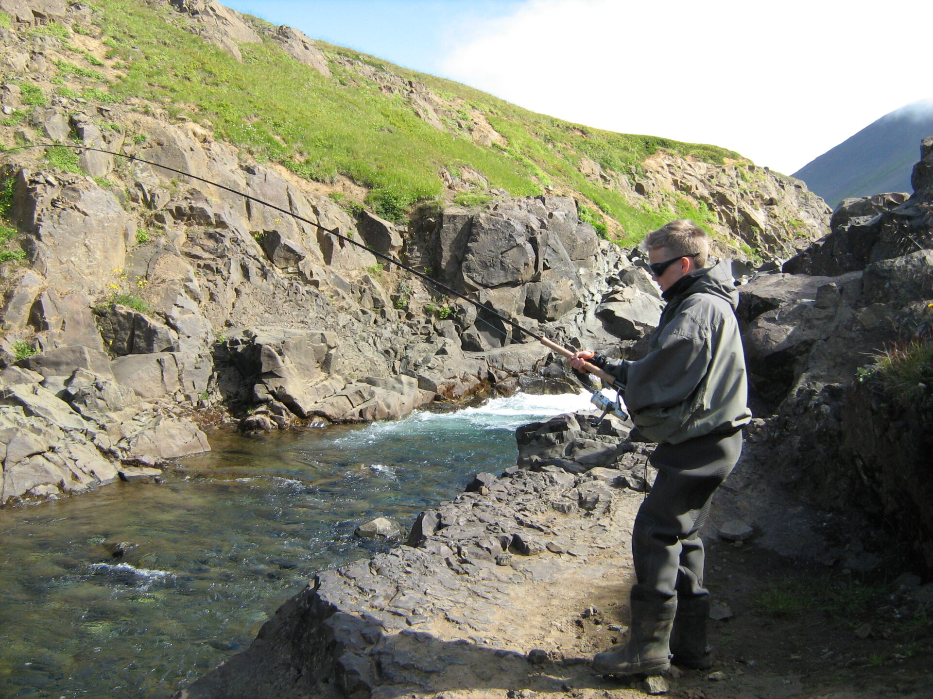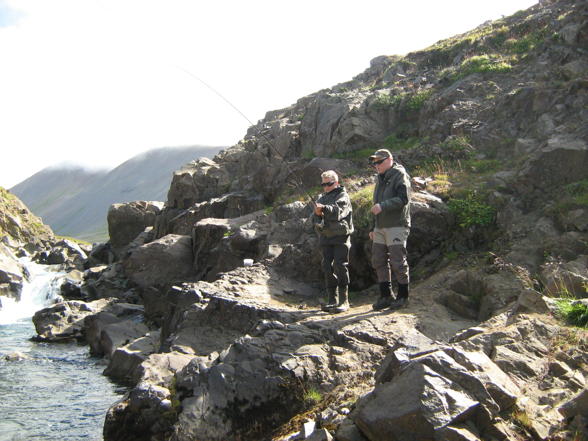 They saw fish in many places throughout the river. On the photos you see Johannes Karl 12 years old landing a fish in waterfall Kjalarlandsfoss.